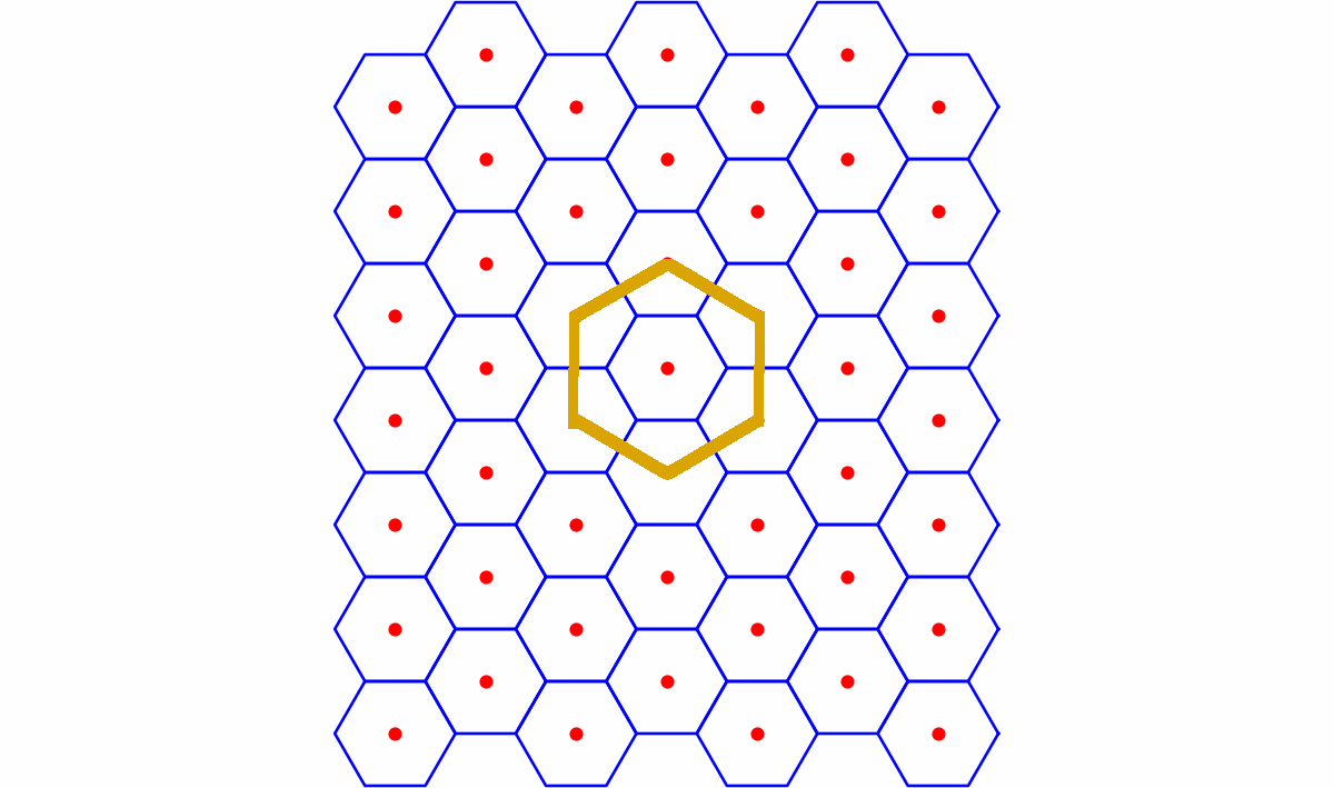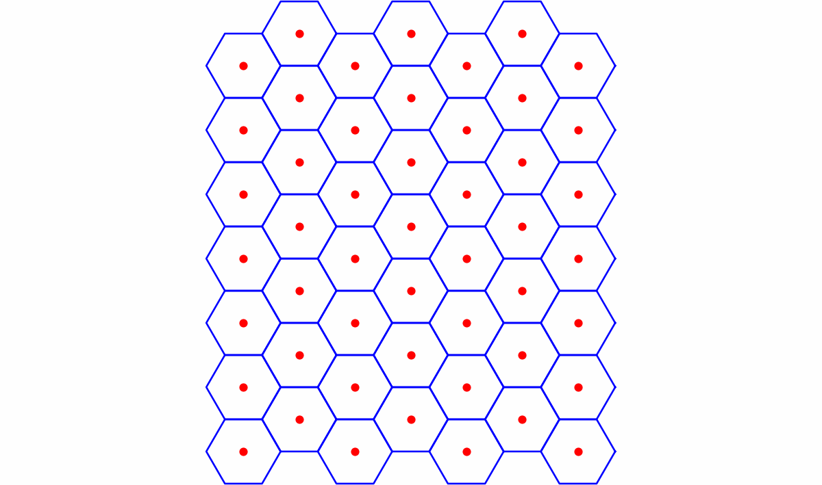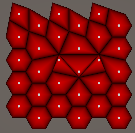 You may notice something interesting about this image. There is a polygon formed from the connections of all the green lines (the adjacencies between each tile). In the center of each of these polygons formed is actually a vertex of a hexagon. This forms the basis of this tiling algorithm: by finding the center of each of these polygons, you can turn those centers into the vertices for the tiles. An example of how this would work is shown below for a hexagonal grid: