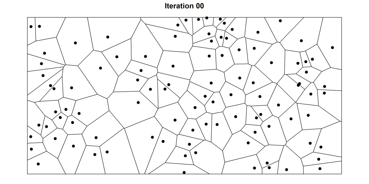 The tiles can be unevenly sized, so a post-processing step can be done to repeatedly reapply voronoi's algorithm on the cells' centroid, or geometric center.