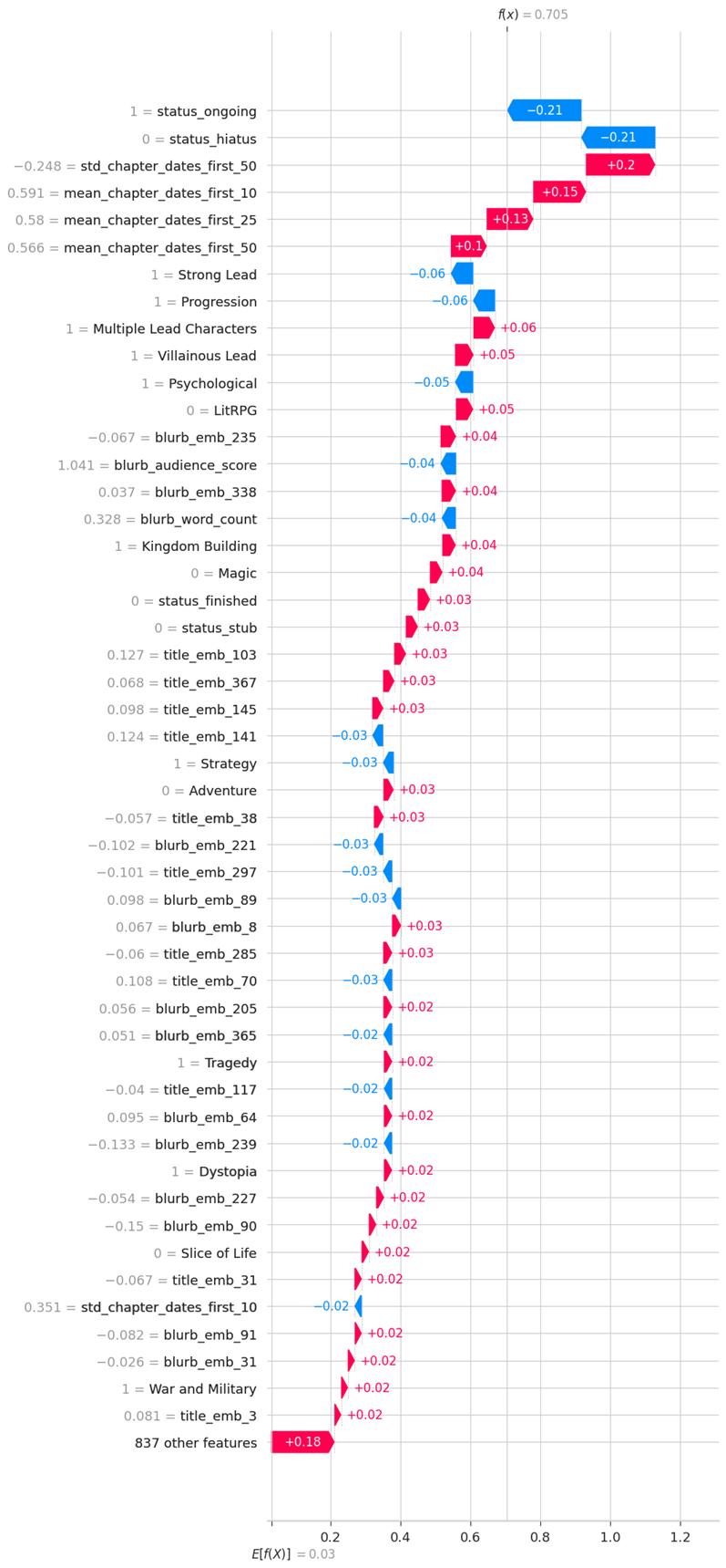 The study focused mainly on Royal Road and, to a lesser extent, Scribble Hub. Because the dataset is limited, results may not fully generalize to other web serial platforms. Portal fantasy, for example, is a relatively niche genre in traditional media, but highly concentrated in this dataset, leading to it being a relatively impactful feature.