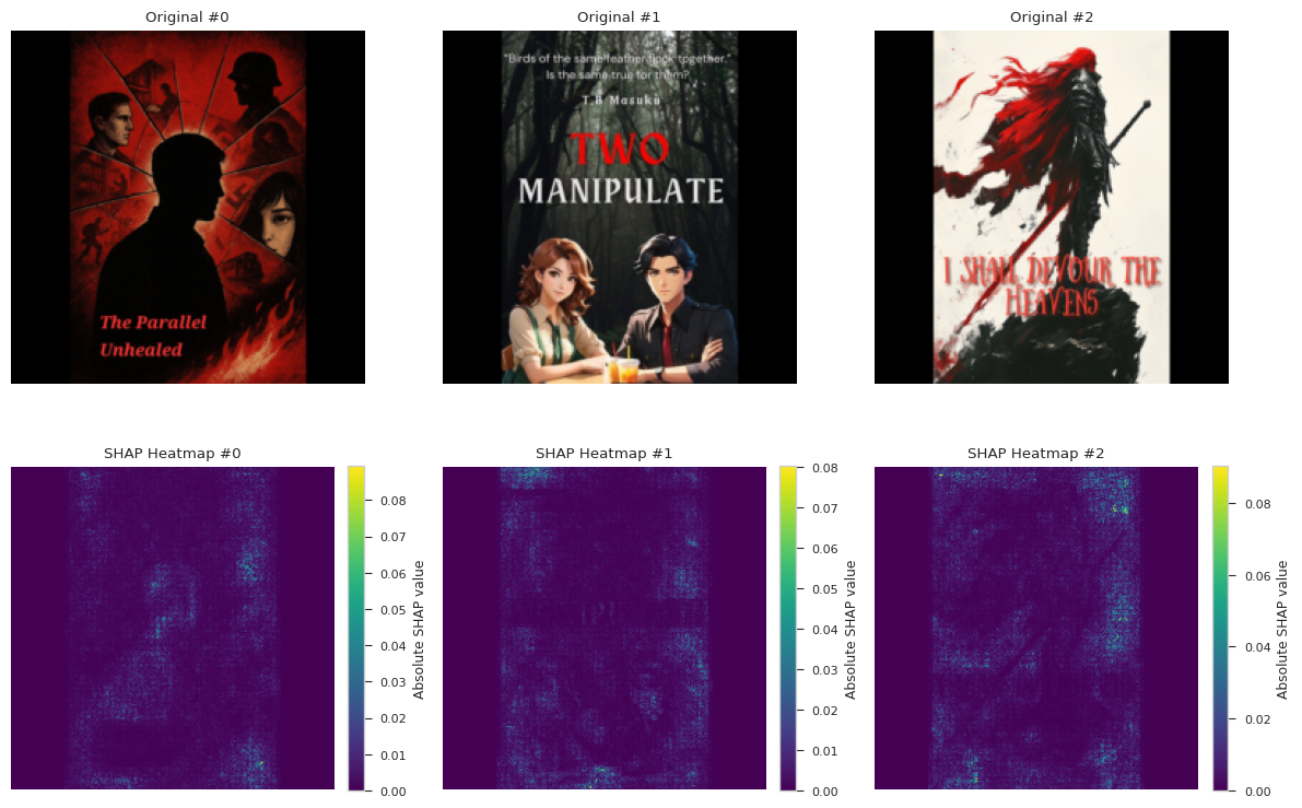 But the following sample images showcase mostly dark blue pixels, indicating that the models don’t seem to find any useful information from cover images.