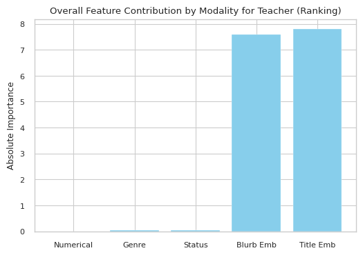 We see that the number of ratings and favourites play a large role influencing predictions. The title and blurb also seem to be highly impactful. When visualizing the collective impact of the title and blurb, we see that they outnumber every other feature combined: